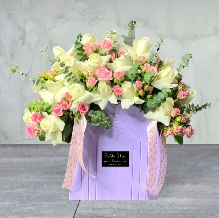 باکس گل شامل ۲۰شاخه گل رز سفیدو رز مینیاتوری صورتی
